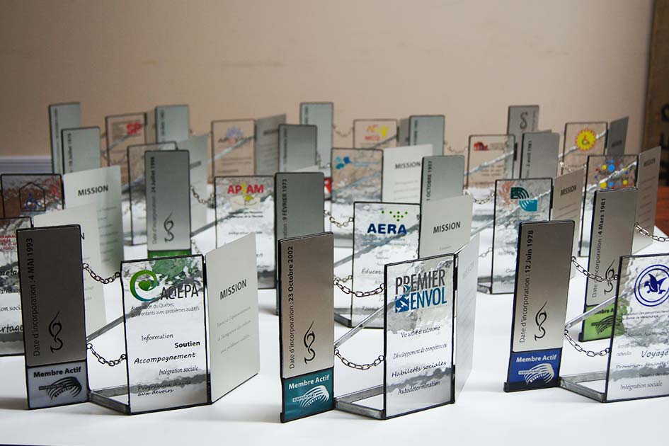L’équipe de Charmille offre un service clés en main pour la fabrication de vitraux et d’objets corporatifs faits à partir de verre, tels que des trophées. Nous prenons le temps de discuter avec le client de ses besoins et mettons tout en œuvre pour réaliser le mandat.